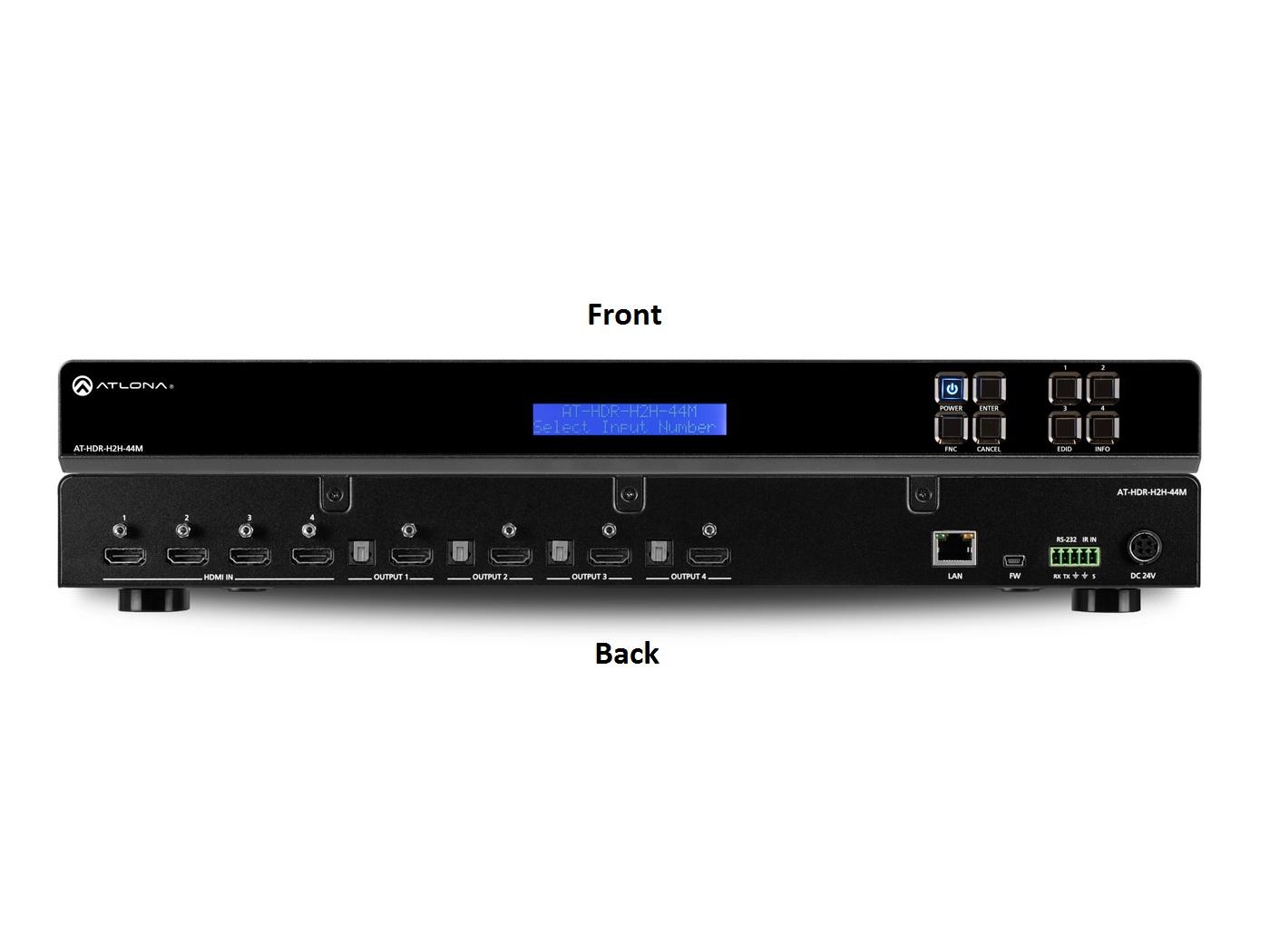 PHA+VGhlIEF0bG9uYcKgPHN0cm9uZz5BVC1IRFItSDJILTQ0TTwvc3Ryb25nPsKgaXMgYSA0w5c0IEhETUkgbWF0cml4IHN3aXRjaGVyIGZvciBoaWdoIA0KZHluYW1pYyByYW5nZSAoSERSKSBmb3JtYXRzLiBJdCBpcyBIRENQIDIuMiBjb21wbGlhbnQgYW5kIHN1cHBvcnRzIDRLL1VIRCB2aWRlbyBAIDYwIA0KSHogd2l0aCA0OjQ6NCBjaHJvbWEgc2FtcGxpbmcsIGFzIHdlbGwgYXMgSERNSSBkYXRhIHJhdGVzIHVwIHRvIDE4IEdicHMuIFRoZSBIRFItSDJILQ0KNDRNIGlzIGlkZWFsIGZvciByZXNpZGVudGlhbCBhcHBsaWNhdGlvbnMgd2l0aCB0aGUgbGF0ZXN0IGFzIHdlbGwgYXMgZW1lcmdpbmcgNEsvVUhEIA0KYW5kIEhEUiBzb3VyY2VzIGFuZCBkaXNwbGF5cy4gSXQgaXMgY29tcGF0aWJsZSB3aXRoIGFsbCB2aWRlbyByZXNvbHV0aW9ucywgYXVkaW8gDQpmb3JtYXRzLCBhbmQgY29sb3Igc3BhY2UgZm9ybWF0cyBzdXBwb3J0ZWQgaW4gdGhlIEhETUkgMi4wYiBzcGVjaWZpY2F0aW9uLCBwbHVzIHRoZSANCmFiaWxpdHkgdG8gcGFzcyBtZXRhZGF0YSBmb3IgSERSIGNvbnRlbnQuIFRoZSBIRFItSDJILTQ0TSBpbmNsdWRlcyBFRElEIGFuZCBIRENQIA0KbWFuYWdlbWVudCBmZWF0dXJlcywgYW5kIGNhbiBzZW5kIENFQyBkaXNwbGF5IGNvbnRyb2wgaW5kZXBlbmRlbnRseSB0byBlYWNoIG91dHB1dC4gDQpBIFRPU0xJTksgZGlnaXRhbCBhdWRpbyBvdXRwdXQgaXMgcGFpcmVkIHdpdGggZWFjaCBIRE1JIG91dHB1dCBmb3Igc2VuZGluZyBkZS0NCmVtYmVkZGVkIEhETUkgYXVkaW8gdG8gYW4gQVYgcmVjZWl2ZXIgb3Igc291bmRiYXIuIFRoZSBIRFItSDJILTQ0TSBjYW4gYmUgY29udHJvbGxlZCANCnZpYSBFdGhlcm5ldCwgUlMtMjMyLCBhbmQgSVIuIEEgaGFuZGhlbGQgSVIgcmVtb3RlIGNvbnRyb2wgaXMgaW5jbHVkZWQuPC9wPg0KPHA+VGhlIEhEUi1IMkgtNDRNIGlzIGRlc2lnbmVkIHRvIGRlbGl2ZXIgZGVwZW5kYWJsZSwgcHJpc3RpbmUtcXVhbGl0eSBpbWFnZSANCnByZXNlbnRhdGlvbnMgaW4gcmVzaWRlbnRpYWwgYXMgd2VsbCBhcyBjb21tZXJjaWFsIGFwcGxpY2F0aW9ucy4gSXQgaW5jbHVkZXMgDQpBdGxvbmHigJlzIGF3YXJkLXdpbm5pbmcgMTAgeWVhciBsaW1pdGVkIHByb2R1Y3Qgd2FycmFudHkgYW5kIGN1c3RvbWVyIHN1cHBvcnQgDQpzZXJ2aWNlcywgc28gdGhhdCBpbnRlZ3JhdG9ycyBjYW4gc3BlY2lmeSwgcHVyY2hhc2UsIGFuZCBpbnN0YWxsIHdpdGggY29uZmlkZW5jZS48L3A+DQo8cD48c3Ryb25nPkFwcGxpY2F0aW9uczwvc3Ryb25nPjwvcD4NCiAgICAgIDx1bD4NCiAgICAgICAgPGxpPjxzdHJvbmc+UmVzaWRlbnRpYWwgaW5zdGFsbGF0aW9uczwvc3Ryb25nPsKg4oCTIFRoZSBIRFItSDJILTQ0TSBpcyBkZXNpZ25lZCANCmZvciBBViBzeXN0ZW1zIHdpdGggdGhlIGxhdGVzdCBVSEQgYW5kIEhEUiBzb3VyY2VzIHN1Y2ggYXMgVWx0cmEgSEQgQmx1LXJheSBwbGF5ZXJzLCANCnBsdXMgY29tcGF0aWJsZSB0ZWxldmlzaW9ucyBhbmQgcHJvamVjdG9ycy48L2xpPg0KICAgICAgICA8bGk+PHN0cm9uZz5UViBzaG93cm9vbXM8L3N0cm9uZz7CoOKAkyBUaGUgSERSLUgySC00NE0gY2FuIGJlIHVzZWQgZm9yIHJlbGlhYmxlIA0KY29udGVudCBkaXN0cmlidXRpb24gdG8gdGVsZXZpc2lvbnMsIHRvIHByb3Blcmx5IGRlbW9uc3RyYXRlIHRoZSBxdWFsaXR5IGFuZCBhcHBlYWwgDQpvZiA0SyBhbmQgSERSIHByb2dyYW1taW5nLjwvbGk+DQogICAgICAgIDxsaT48c3Ryb25nPlByb2Zlc3Npb25hbCBBViBhcHBsaWNhdGlvbnM8L3N0cm9uZz7CoOKAkyBBdGxvbmEgNEsgSERSIHByb2R1Y3RzIA0KYXJlIGlkZWFsIGZvciBmdWxsLW1vdGlvbiwgaGlnaGx5IGRldGFpbGVkIDRLIGdyYXBoaWNzIHByZXNlbnRhdGlvbnMgZm9yIA0KdmlzdWFsaXphdGlvbiwgM0QgcmVuZGVyaW5ncywgc2ltdWxhdGlvbnMsIGFuZCBtb3JlLjwvbGk+DQo8L3VsPg0KPHA+PHN0cm9uZz5Db25maWd1cmVkIGFuZCBNYW5hZ2VkIGJ5IEFNUzwvc3Ryb25nPjwvcD4NCiAgICAgIDxwPlRoZcKgQXRsb25hIE1hbmFnZW1lbnQgU3lzdGVtIChBTVMpwqBpcyBhIHBvd2VyZnVsIG5ldHdvcmsgc29mdHdhcmUgcGxhdGZvcm0gDQppZGVhbCBmb3IgY29uZmlndXJpbmcsIG1hbmFnaW5nLCBhbmQgbW9uaXRvcmluZyB0aGUgSERSLUgySC00NE0gYW5kIG90aGVyIEF0bG9uYSBJUC0NCmNvbnRyb2xsYWJsZSBkZXZpY2VzIG92ZXIgYSBMQU4sIFdBTiwgb3IgVlBOLiBBTVMgaXMgYXZhaWxhYmxlIGZyZWUgZnJvbSBBdGxvbmEsIGFuZCANCmdyZWF0bHkgc3RyZWFtbGluZXMgaW5zdGFsbGF0aW9uIGFuZCBtYWludGVuYW5jZSBvZiBzZXZlcmFsIEF0bG9uYSBwcm9kdWN0cyANCnRocm91Z2hvdXQgYSBmYWNpbGl0eSBvciBlbnRlcnByaXNlLCBmcm9tIGEgc3RhbmRhcmQgd2ViIGJyb3dzZXIuPC9wPg0KPHA+PHN0cm9uZz5GZWF0dXJlczwvc3Ryb25nPjwvcD4NCjx1bD48bGk+DQogICAgICA8cD48c3Ryb25nPjTDlzQgSERNSSBtYXRyaXggc3dpdGNoZXI8L3N0cm9uZz48L3A+DQogICAgICA8dWw+DQogICAgICAgIDxsaT5EZWxpdmVycyBoaWdoIHBlcmZvcm1hbmNlLCByZWxpYWJsZSBIRE1JIHNpZ25hbCBtYXRyaXggc3dpdGNoaW5nPC9saT4NCiAgICAgICAgPGxpPkVhc3kgdG8gaW5zdGFsbCBhbmQgZGVwbG95IGluIHJlc2lkZW50aWFsIGFuZCBjb21tZXJjaWFsIGFwcGxpY2F0aW9uczwvDQpsaT4NCiAgICAgIDwvdWw+DQogICAgICA8L2xpPg0KICA8bGk+PHN0cm9uZz5GYXN0LCBibGluay1mcmVlIHN3aXRjaGluZzwvc3Ryb25nPjwvbGk+DQo8L3VsPg0KPHVsPg0KICA8dWw+DQogICAgPGxpPkZhc3QgaW5wdXQgc2VsZWN0aW9uIHN3aXRjaGluZyBlbGltaW5hdGVzIHZpZGVvIGJsaW5raW5nIGluIG90aGVyIHpvbmVzPC9saT4NCiAgICA8bGk+RWxpbWluYXRlcyBsb25nIHdhaXQgdGltZXMgY2F1c2VkIGJ5IGhhbmRzaGFraW5nIGFuZCBIRENQIGtleSB2YWxpZGF0aW9uIGZvciANCmFuIHVuaW50ZXJydXB0ZWQgdmlld2luZyBleHBlcmllbmNlIGluIGFsbCB6b25lcyAgPC9saT4NCiAgPC91bD4NCiAgPGxpPjxzdHJvbmc+NEsvVUhEIGNhcGFiaWxpdHkgQCA2MCBIeiB3aXRoIDQ6NDo0IGNocm9tYSBzYW1wbGluZywgcGx1cyBzdXBwb3J0IGZvciANCkhEUiBmb3JtYXRzPC9zdHJvbmc+PC9saT4NCiAgPHVsPg0KICAgIDxsaT5Db21wYXRpYmlsaXR5IHdpdGggbmV3IGFuZCBlbWVyZ2luZyA0Sy9VSEQgYW5kIEhEUi1jYXBhYmxlIHNvdXJjZXMgYW5kIA0KZGlzcGxheXM8L2xpPg0KICAgIDxsaT5GdWxseSBzdXBwb3J0cyB2aWRlbyByZXNvbHV0aW9ucywgYXVkaW8gZm9ybWF0cywgYW5kIGNvbG9yIHNwYWNlIGZvcm1hdHMgaW4gDQp0aGUgSERNSSAyLjBiIHNwZWNpZmljYXRpb24gIDwvbGk+DQogIDwvdWw+DQogIDxsaT48c3Ryb25nPkhEQ1AgMi4yIGNvbXBsaWFudDwvc3Ryb25nPjwvbGk+DQogIDx1bD4NCiAgICA8bGk+QWRoZXJlcyB0byBsYXRlc3Qgc3BlY2lmaWNhdGlvbiBmb3IgSGlnaC1iYW5kd2lkdGggRGlnaXRhbCBDb250ZW50IA0KUHJvdGVjdGlvbjwvbGk+DQogICAgPGxpPkFsbG93cyBwcm90ZWN0ZWQgY29udGVudCBzdHJlYW0gdG8gcGFzcyBiZXR3ZWVuIGRldmljZXM8L2xpPg0KICA8L3VsPg0KICA8bGk+PHN0cm9uZz5JbmRlcGVuZGVudCBDRUMgZGlzcGxheSBjb250cm9sIHRvIGVhY2ggb3V0cHV0PC9zdHJvbmc+PC9saT4NCiAgPHVsPg0KICAgIDxsaT5TZW5kcyBkaXNwbGF5IHBvd2VyIG9uL29mZiBjb250cm9sIHRvIGEgc3BlY2lmaWMgSERNSSBvdXRwdXQ8L2xpPg0KICAgIDxsaT5FbmFibGVzIGluZGVwZW5kZW50IGNvbnRyb2wgb2YgZGlzcGxheXMgY29ubmVjdGVkIHRvIHRoZSBtYXRyaXggc3dpdGNoZXI8L2xpPg0KICAgIDxsaT5DRUMgY29udHJvbCBjYW4gYmUgdHJpZ2dlcmVkIGJ5IElQIG9yIFJTLTIzMiBjb250cm9sIGNvbW1hbmRzPC9saT4NCiAgPC91bD4NCiAgPGxpPjxzdHJvbmc+RURJRCBtYW5hZ2VtZW50PC9zdHJvbmc+PC9saT4NCiAgPHVsPg0KICAgIDxsaT5NYW5hZ2VzIEVESUQgY29tbXVuaWNhdGlvbnMgd2l0aCB0aGUgc291cmNlIHRocm91Z2ggYSBkaXNwbGF54oCZcyBFRElEIG9yIA0KaW50ZXJuYWxseSBzdG9yZWQgRURJRDwvbGk+DQogICAgPGxpPkVuc3VyZXMgZGVzaXJlZCBhdWRpbyBmb3JtYXRzIGFuZCB2aWRlbyByZXNvbHV0aW9ucyBhcmUgcHJvdmlkZWQgdG8gdGhlIEFWIA0Kc3lzdGVtPC9saT4NCiAgPC91bD4NCiAgPGxpPjxzdHJvbmc+SERDUCBtYW5hZ2VtZW50PC9zdHJvbmc+PC9saT4NCiAgPHVsPg0KICAgIDxsaT5IRENQIGNvbXBsaWFuY2UgY2FuIGJlIGRpc2VuZ2FnZWQgdGhyb3VnaCBBTVMgb3IgYSBjb250cm9sIHN5c3RlbTwvbGk+DQogICAgPGxpPkFsbG93cyBub24tcHJvdGVjdGVkIG1hdGVyaWFsIGZyb20gUENzIHRvIHBhc3MgdG8gbm9uLWNvbXBsaWFudCBkaXNwbGF5cywgDQpzdHJlYW1pbmcgZGV2aWNlcywgYW5kIHRlbGVjb25mZXJl