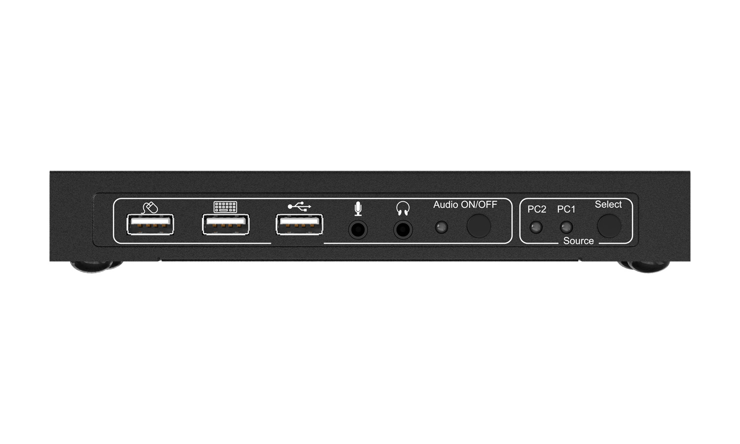 The rear panel of the BG-UHD-KVM21A is equipped with two PC connections, each including one USB 2.0 type-B host port and one HDMI 1.4 input. There is also one HDMI 1.4 output for connection to a monitor. On the front panel, there are three USB 2.0 ports for a keyboard, mouse, and a spare port for additional devices. The BG-UHD-KVM21A also provides 3.5mm audio connections for a microphone and headphones/speakers.