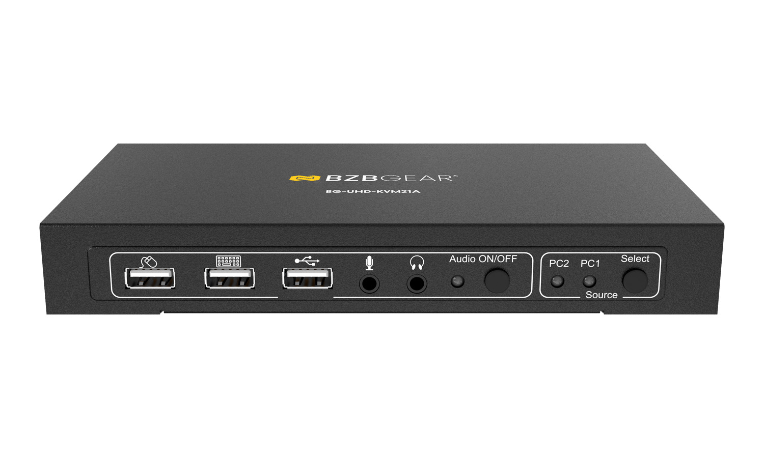 The BG-UHD-KVM21A is simple to operate using the front panel buttons. The source select button toggles between the two connected computers, switching the HDMI and peripheral connections. It can also be operated using hotkeys. There is also an audio toggle which enables/disables the audio in/out connections.